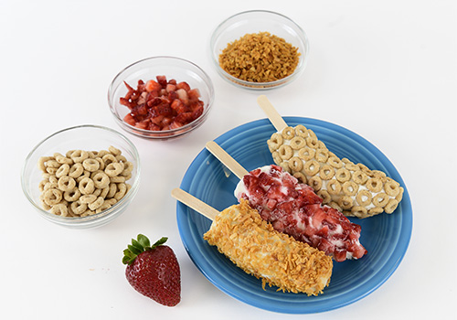 Slice a banana in half and add a popsicle stick as a handle. Dip the banana in vanilla yogurt and roll in whole grain cereal, coconut flakes or finely chopped fresh fruit pieces. Freeze and enjoy as a cold treat!