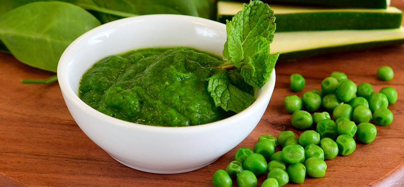 Serve up all the green goodness with this homemade baby puree! This easy recipe pairs the sweet flavor of peas with zucchini, spinach and a nice hint of fresh mint. Your infant is sure to love this new, flavorful take on simple pureed peas.