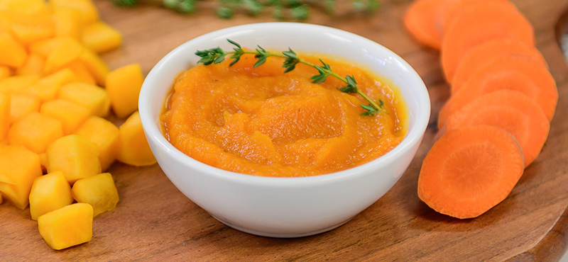Introduce sweet and savory flavors with this homemade carrot and butternut squash puree! With a hint of thyme, this simple 3-ingredient blend offers your baby delicious new vegetables to try. It’s a perfect recipe for spoon-feeding and beginning eaters.