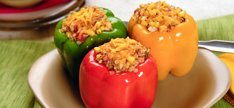These delicious stuffed peppers are meatless and loaded with fresh Southwest flavors! Rice, corn, green chiles and cheese make a delicious filling to complement the flavor of your favorite bell pepper. Enjoy as a main dish or side.